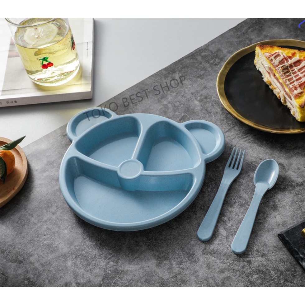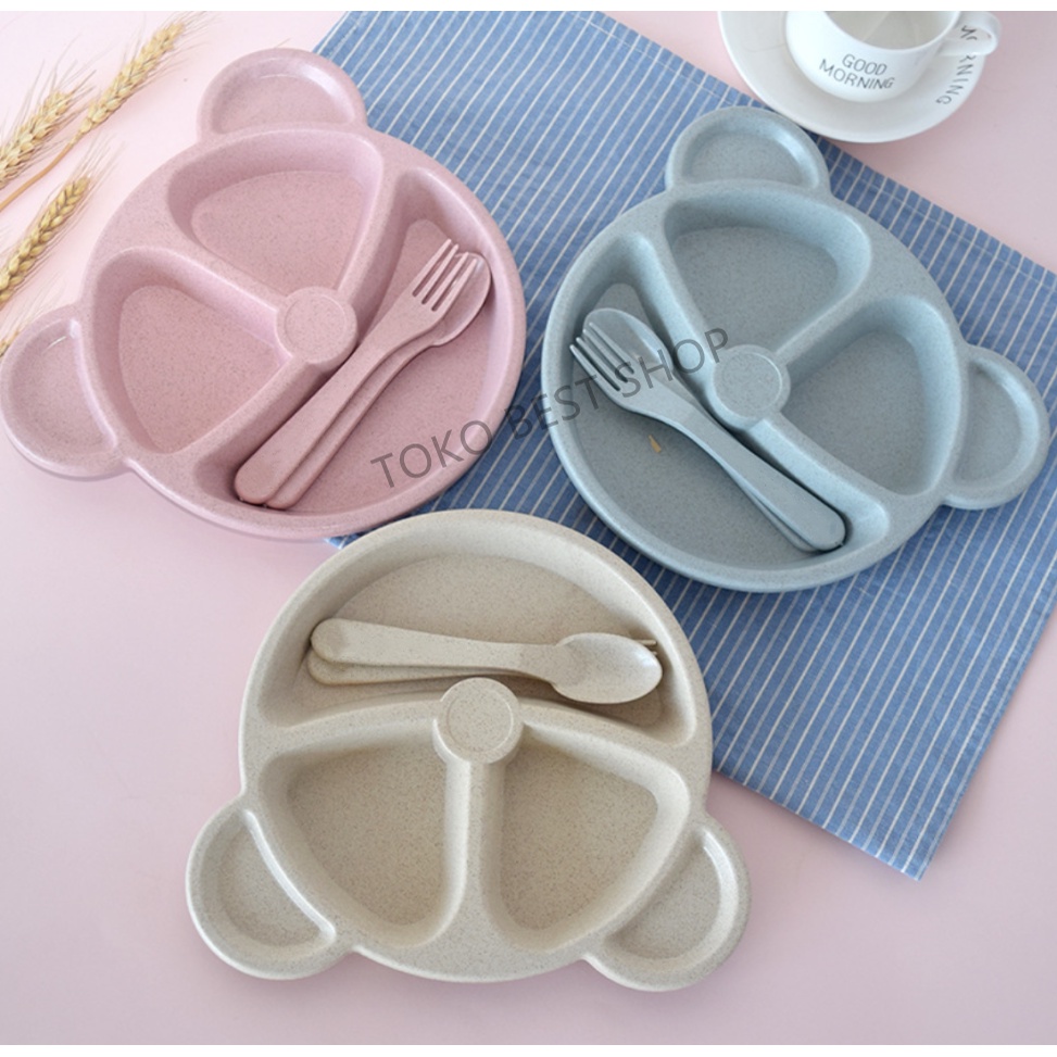 Harga [TOKO BEST SHOP]Set piring makan anak-anak dari gandum dibagi kotak/Setelan tiga potong/Kotak Bekal Makan anak dan bayi/bahan Gandum organik/produk serat