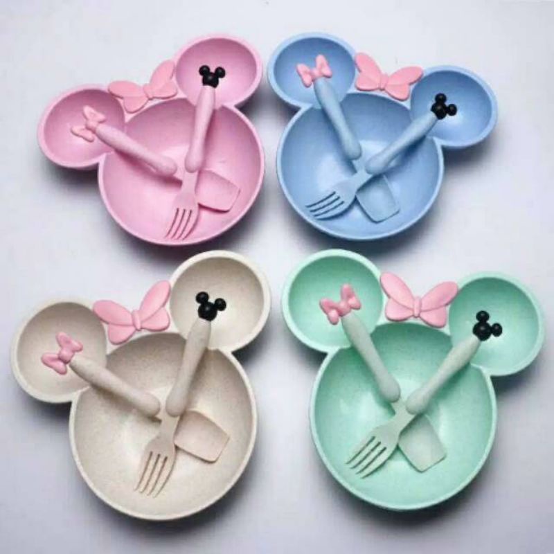 Baby Children Set Piring Gelas Sendok Garpu Peralatan Makan Set Anak Aman Bahan Alami Lucu 4 PCS